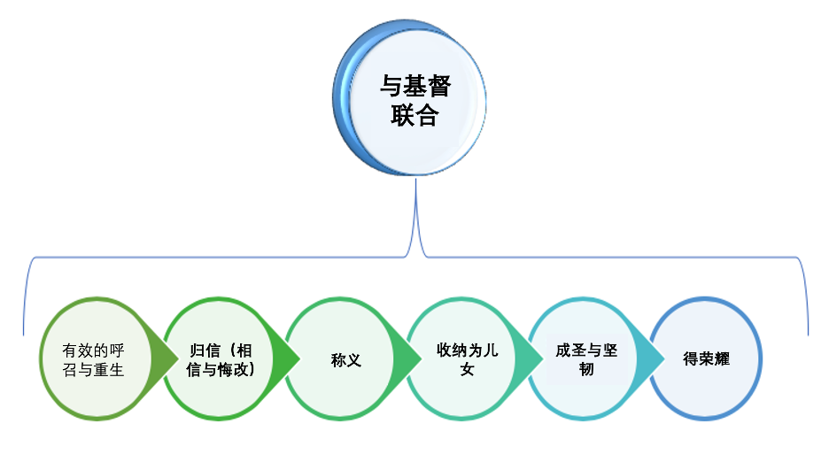 清教徒如威廉·珀金斯(William Perkins)常把救恩的次序称为“救恩的金链”(the golden chain of salvation)。这条金链的每一个环节彼此相连,缺一不可,合在一起形成一条无法断开的链条。神那有效的召唤或呼召,是这条链的第一个环节,有时也与重生(新生)同义;由此生发出后续的一切。在这呼召中,圣灵首先使罪人与耶稣基督联合;确切地说,罪人被呼召归向基督,好使他得享在基督里的一切救恩益处。这些益处包括信心与悔改、公义的新身份(称义)、蒙神悦纳,成为神的儿女(收纳)、效法基督的形象(成圣),直到有一天完全得着荣耀。